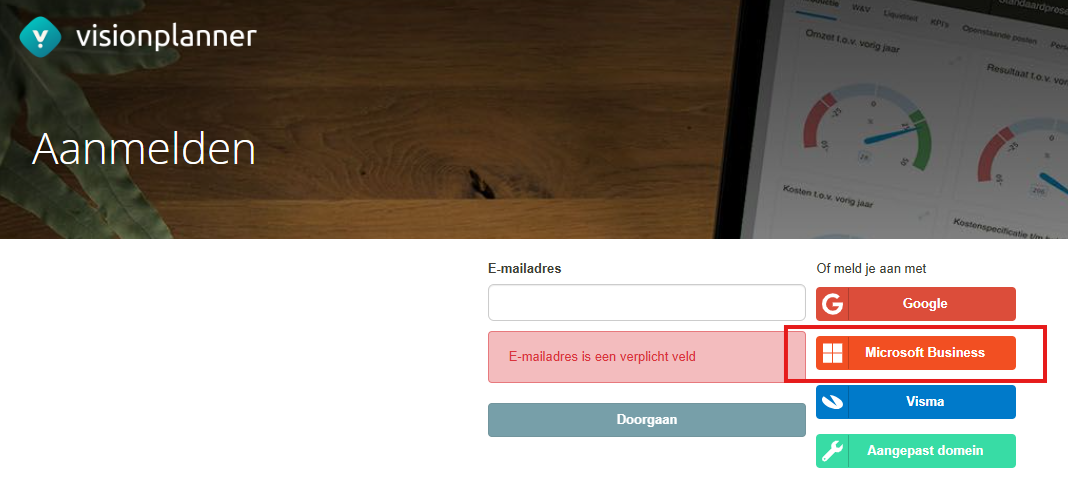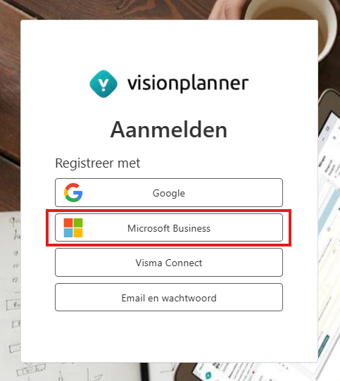 De klant kan vanaf nu, wanneer er via Microsoft al ingelogd is via bijvoorbeeld Microsoft Edge, direct inloggen bij Visionplanner door aan te melden via 'Microsoft Business'.